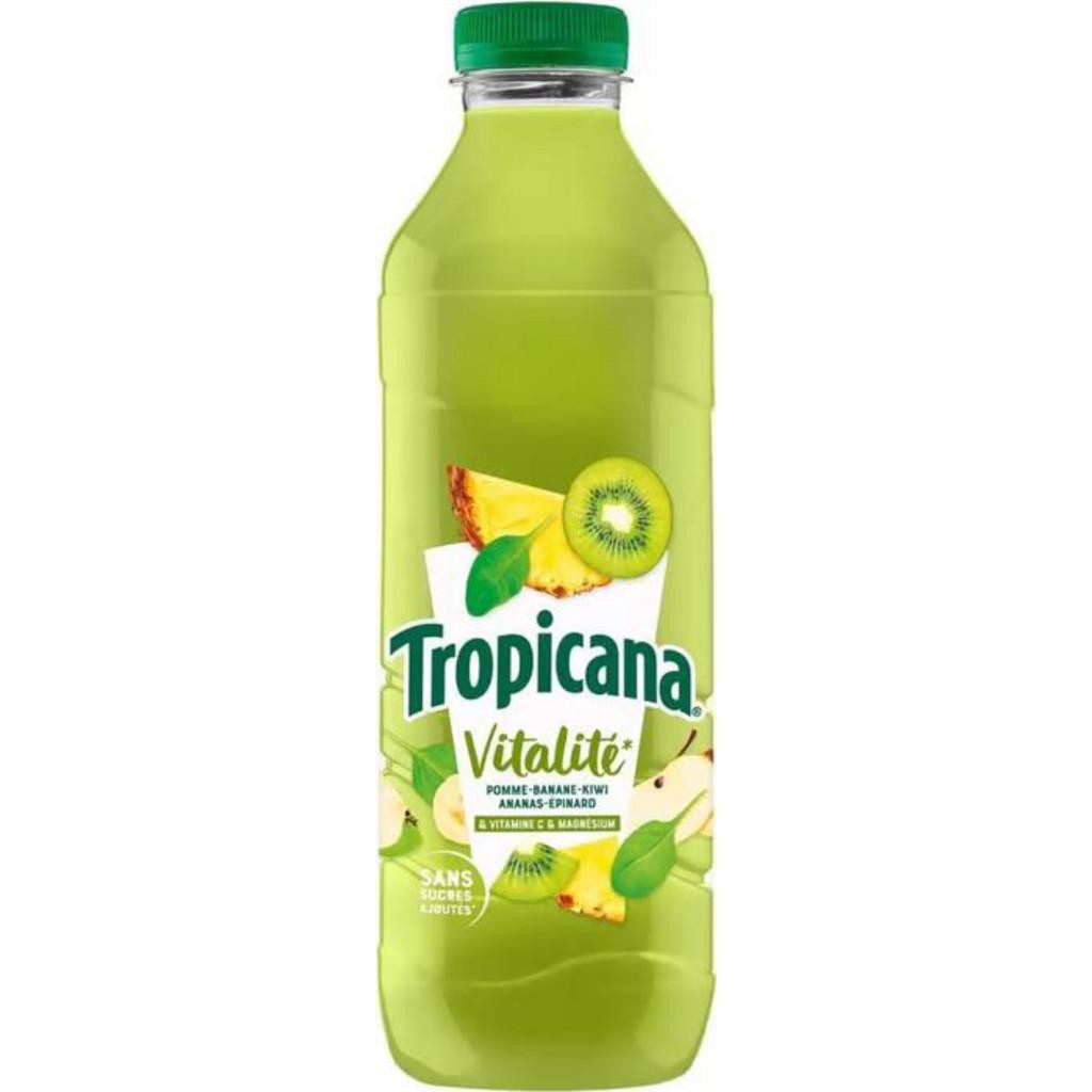 Ensoleillée et généreuse, la nature vous offre ses fruits riches en couleurs et en saveurs. Retrouvez dans chaque verre de Tropicana une promesse toute simple, la promesse d'une vie pleine de sensations. Lot économique de 6 bouteilles. Jus de fruits (96%) [jus d'ananas, jus de pomme, purée de banane, purée de kiwi, jus de raisin],purée d'épinard,jus de citron,lactate de magnésium,extrait de spiruline,extrait de carthame. Jus de pomme à base de concentré (49%), eau, purée de banane (10%), purée de kiwi (8%), jus d'ananas (8%), purée de pomme (6%), purée d'épinard (1%), lactate de magnésium, spiruline, extrait de carthame, vitamine C, arôme naturel.