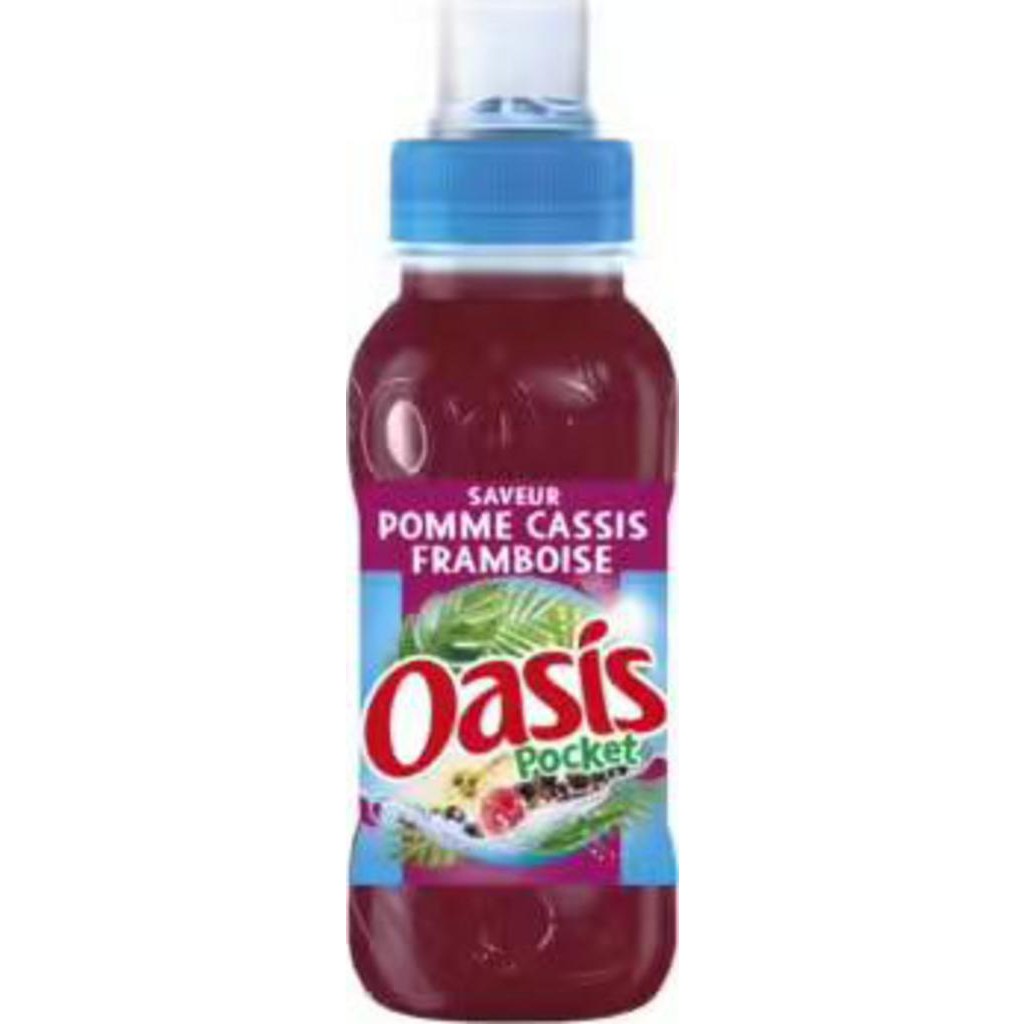 Oasis est une boisson plate aux fruits et à l’eau de source, sans conservateur, sans colorant artificiel et avec une teneur en fruit de 12%. Oasis, c’est la boisson rafraîchissante source de plaisir pour les enfants et pour toute la famille! Lot économique de 72. Eau de source 80%, jus de fruits à base de concentrés 12% (pomme 8,5%, cassis 2%, sureau, framboise 0,2%), sucre, acidifiants : acide citrique et acide malique, arômes naturels, antioxydant : acide ascorbique.